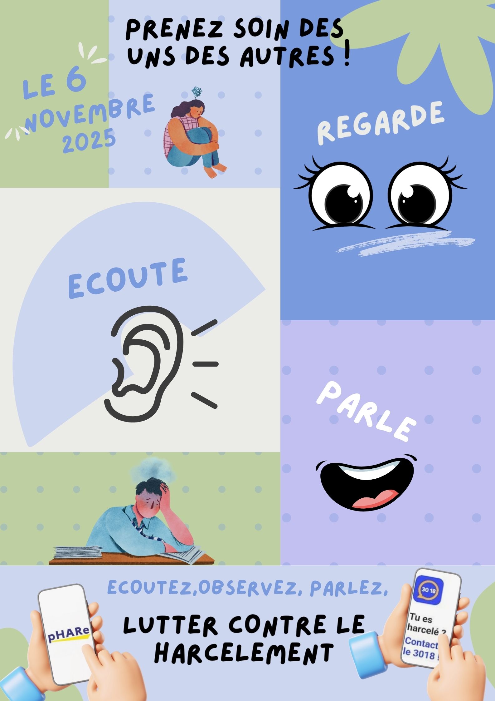 Nous proposons à l'ensemble de la communauté éducative élèves et personnels de venir avec un accessoire ou de s'habiller en VERT pour montrer notre solidarité. Le message est :écoute , regarde et parle .